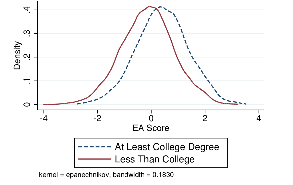 Снимок экрана от 2025-11-17 13-43-46Рисунок 3. Распределение ЕА в зависимости от уровня образования. Синий штрих — как минимум колледж, красный сплошной — в колледже не учился.