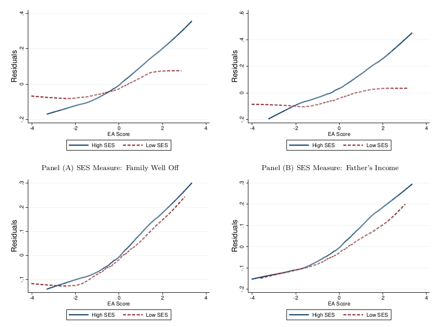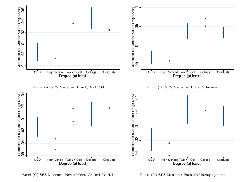 Панель B таблицы 4 демонстрирует, что каждый из показателей SES является релевантным предиктором образовательного уровня. Контролируя оценку EA, наш базовый контроль и образование родителей, мы обнаруживаем, что люди, рожденные в домохозяйствах с высоким SES, должны завершить от 0,15 до 0,73 дополнительных лет обучения, в зависимости от меры SES. Хотя контроль образования родителей составляет почти весь градиент ген-SES, эти измерения SES по-прежнему содержат объяснительную силу для образования даже после того, как мы учтём как образование родителей, так и полигенную оценку.