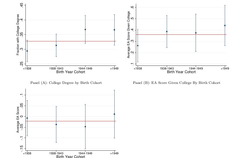 Снимок экрана от 2025-11-17 13-50-50Рисунок 8. Оценки ЕА и шансов на окончание колледжа у мужчин разных годов рождения (абсцисса, средний уровень красным). А. Доля окончивших колледж в когорте. В. Средний ЕА у окончивших колледж (видно замыкание этой группы не только в социальном, но и биологическом плане, тем более что образующие её гены равно представлены во всех слоях населения, и при «выборе лучших» доля окончивших колледж должна расти — но этого не происходит). С. Средний ЕА у всего населения.