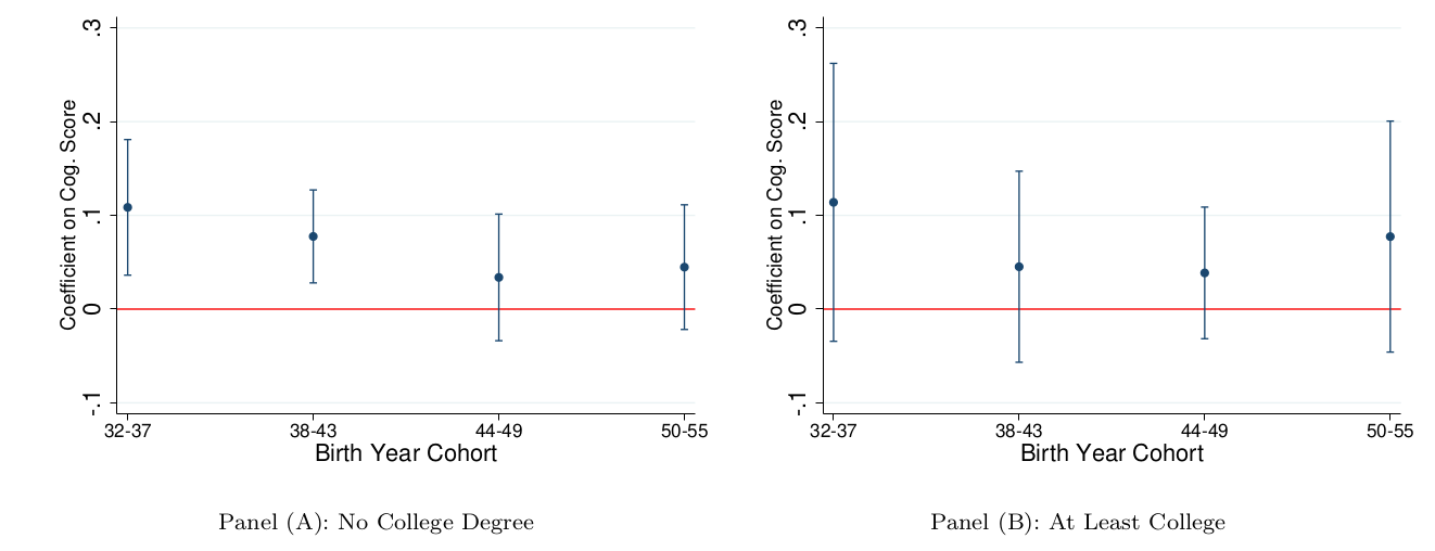 Снимок экрана от 2025-11-17 13-52-48Рисунок 9. Связь между оценкой когнитивных способностей тестами интеллекта (психометричеcкий интеллект) и логарифмом з/пл у лиц разных годов рождения (абсцисса). Ордината — коэффициенты регрессии между данными переменными. А. Без в/о — связь положительна даже после учёта образования. Б. Образование уровня колледжа и выше — зависимость делается всё слабее,  однако везде незначима, кроме данных 1992-1996 гг. Видим, что по мере замыкания «классового барьера», мешающего подъëму, рынок труда больше вознаграждает носителей тех же генотипов, что способствуют более долгому образованию, даже когда его не удалось получить.