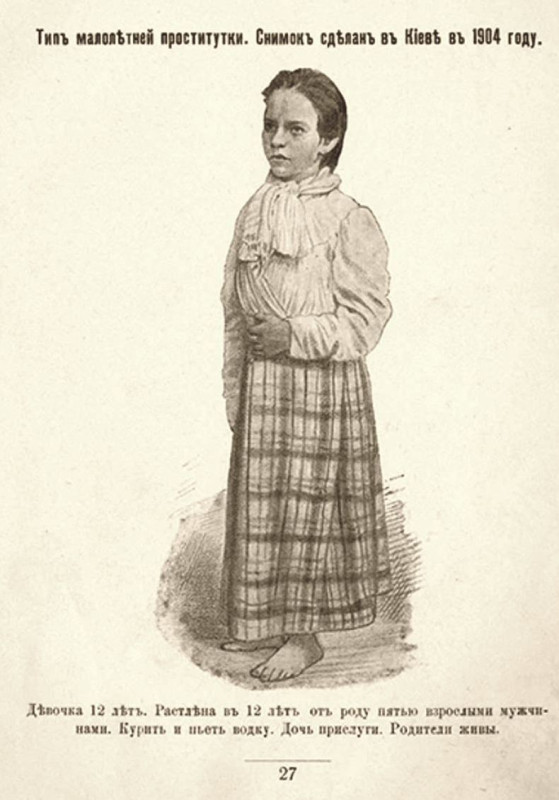 «почти всякая проститутка была обольщена ещё в самом нежном возрасте. В соответствии со статистикой Российской Империи 4/5 всех проституток (80,5%) идут в ряды проституции до гражданского совершеннолетия20».