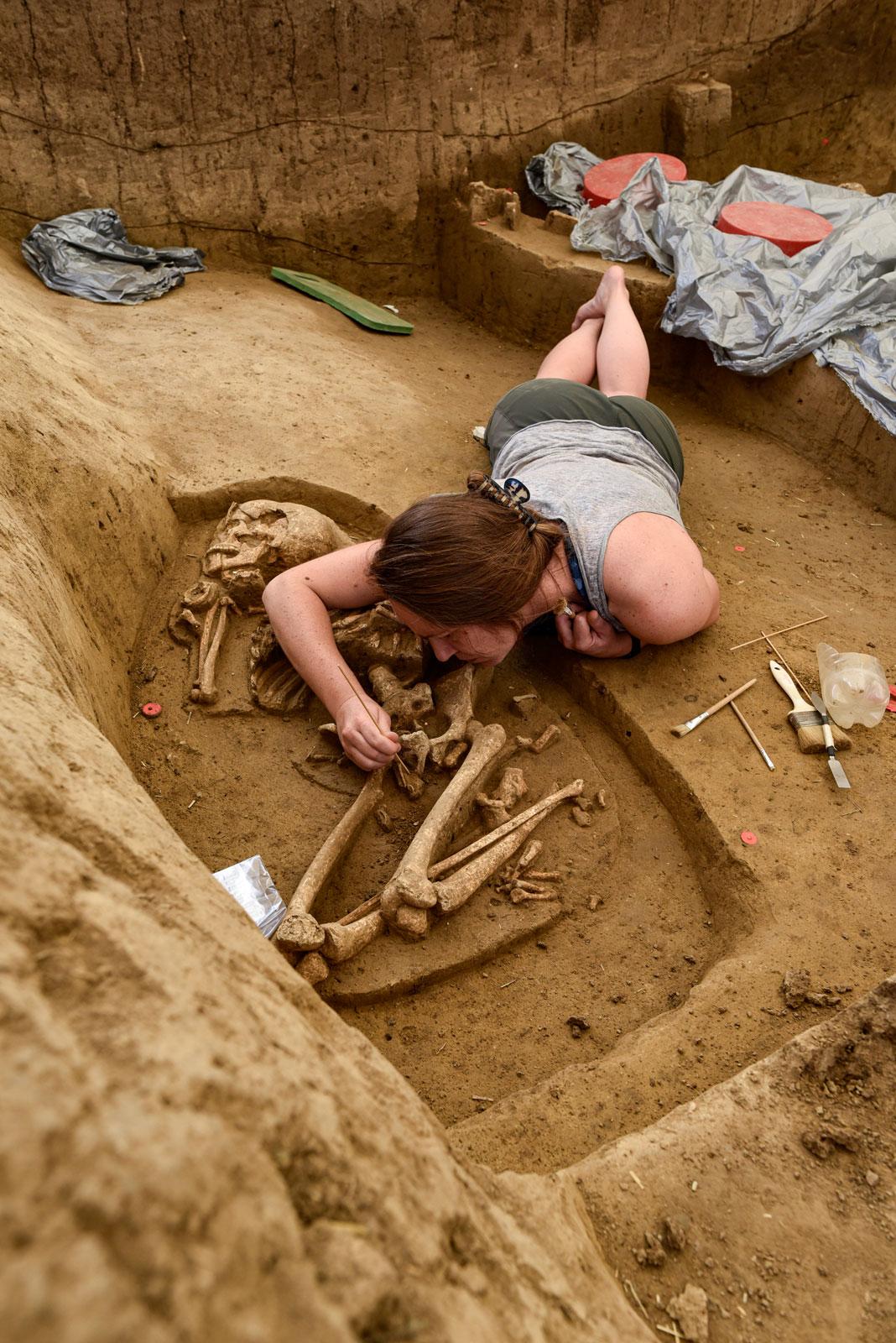 Сейчас команда прослеживает ход событий. В один из последних дней раскопок Фукс и группа студентов присели среди костей, которые они аккуратно извлекли за последние несколько недель. Некоторые были в одних носках, чтобы не повредить хрупкие скелеты. Они тщательно очищали отдельные кости от земли щётками и мастерками. Обнажённые впервые за 7000 лет, останки необходимо поддерживать во влажном состоянии с помощью пульверизаторов, иначе они начнут крошиться. Каждого человека помещают в бумажный пакет и укладывают в маркированную коробку. Позже команда сможет восстановить захоронение в цифровом формате, используя сотни фотографий, сделанных во время раскопок, чтобы найти каждое тело в яме.