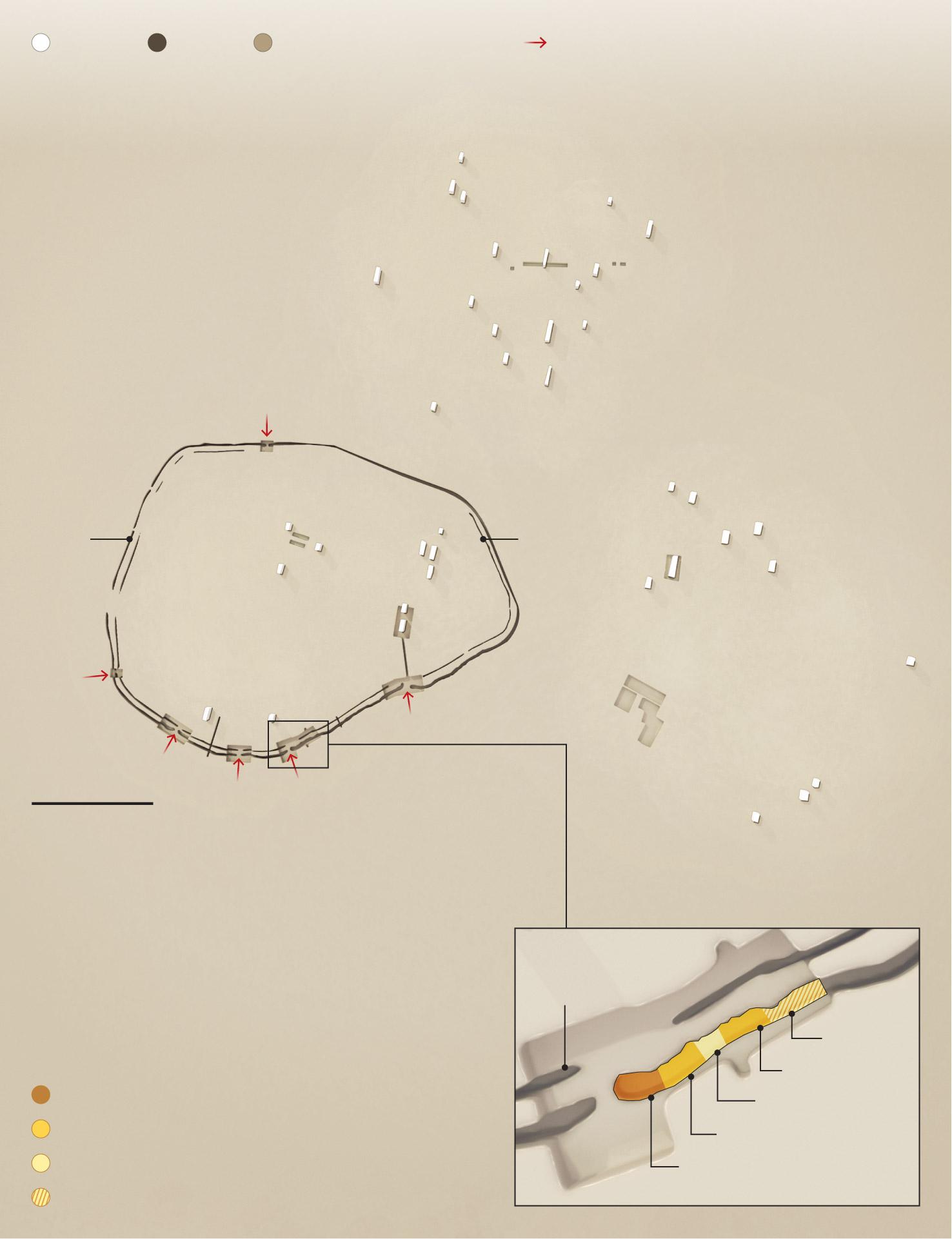 Напротив, ров может быть признаком распада социальных отношений внутри самого Врабле. Все 5 ворот в стенах были обращены в сторону от двух других районов поселения.