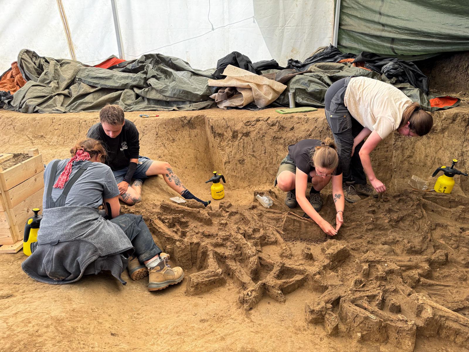 К концу августа команда из Врабле работала в поле уже пять недель, работая под белым тентом, который защищал их как от палящего солнца, так и от дождя, превратившего окрестные поля в липкую грязь. Стоя на краю траншеи глубиной два метра и длиной около десяти метров, Мюллер-Шейссель указывает на перемешанные кости: