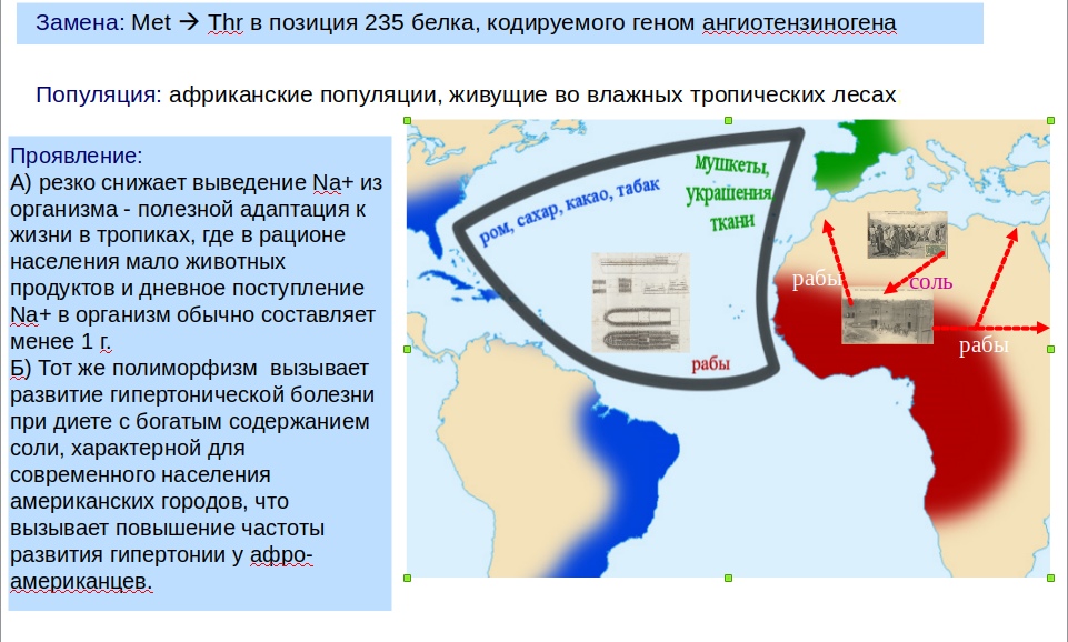 Я люблю рассказывать, что социальное управляет биологическим как всадник лошадью: первое меняется по своим законам, открытым великими Бородачами и изученным разными иными исследователями, а второе «подстраивается» к его изменениям обычным путём, посредством отбора (всё время стабилизирующего). Таков «генетический след» арабской и европейской работорговли – повышенная частота замены Met на Thr в позиция 235 белка, кодируемого геном ангиотензиногена.