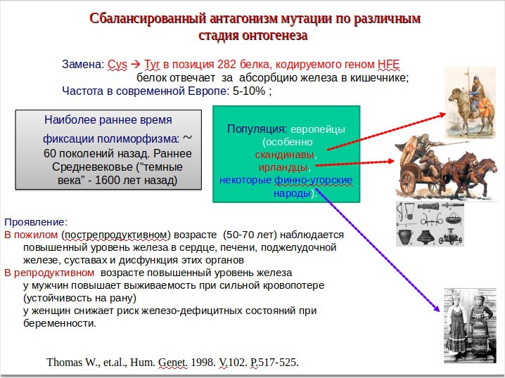 Замена Cys на Tyr в позиция 282 белка, кодируемого геном HFE, усиливающая эффективность абсорбции железа из пищи в кишечнике оказалась довольно частой среди западноевропейцев и восточных финноугорских народностей. В пожилом (пострепродуктивном) возрасте (50-70 лет) у носителей этой мутации наблюдается повышенный уровень железа в сердце, печени, поджелудочной железе, суставах, что ведет к дисфункции этих органов. Но в молодом (репродуктивном) возрасте повышенный уровень железа повышает иммунитет и выживаемость при сильной кровопотере (вместе дают устойчивость на рану). Естественно, что такой полиморфизм оказался полезным, а значит частым среди популяций, в комплекс традиционного поведения которых на определенном временном отрезке входили культы агрессии (скандинавы) или раны (традиционный менталитет кельтского воина предписывал презрение к защитному снаряжению).