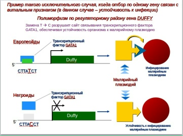 Случаи, когда фенотипический признак действительно в буквальном смысле определяется единственным геном и, больше того, даже единственным нуклеотидом в единственном сайте, большая редкость. Пример такого исключительного случая, когда отбор по одному гену связан с витальным признаком (устойчивости к инфекции) -полиморфизм по регуляторному району гена Duffy.