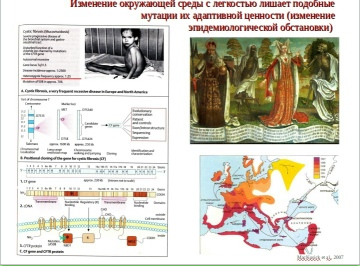 Другой похожий пример — мононуклеотидная делеция остатка фенилаланина ΔF508, но только не в регуляторной некодирующей части, а в белоккодирующем регионе гена СF. Его белок CFTR – один из транспортеров ионов хлора через клеточную (внешнюю или внутреннюю, например, эндоплазматический ретикулум) мембрану. Делеция фенилаланина ведет к дефектам встраивания белка в мембрану и к нестабильности нативной 3D –cтруктуры встроившегося белка. Повышенное содержание хлора в жидкостях тела, равно как и повышенное содержание самих жидкостей в полостях тела у гетерозигот способствует выживанию при таких инфекционных болезнях, как холера и чума. Но у гомозигот развивается муковисцидоз – неинфекционное заболевание. Связанное с отеками множества органов, что ведет к их дисфункции и к быстрой гибели без поддерживающей терапии.